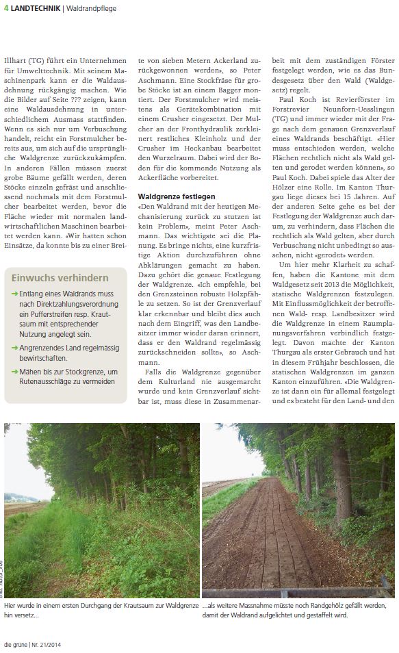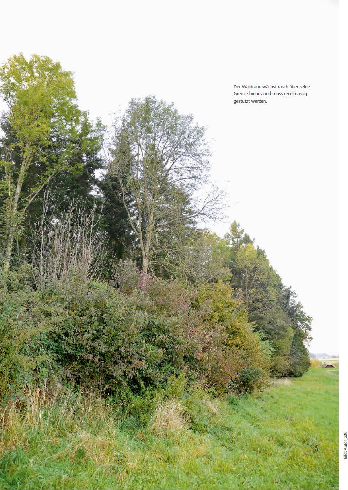 "Den Waldrand mit der heutigen Mechanisierung zurück zu stutzen ist kein Problem", meint Peter Aschmann. Das wichtigste sei die Planung. Es bringe nichts, eine kurzfristige Aktion durchzuführen ohne Abklärungen gemacht zu haben. Dazu gehört die genaue Festlegung der Waldgrenze. "Ich empfehle, bei den Grenzsteinen robuste Holzpfähle zu setzen. So ist der Grenzverlauf klar erkennbar und bleibt dies auch nach dem Eingriff, was den Landbesitzer immer wieder daran erinnert, dass er den Waldrand regelmässig zurückschneiden sollte", so Aschmann.